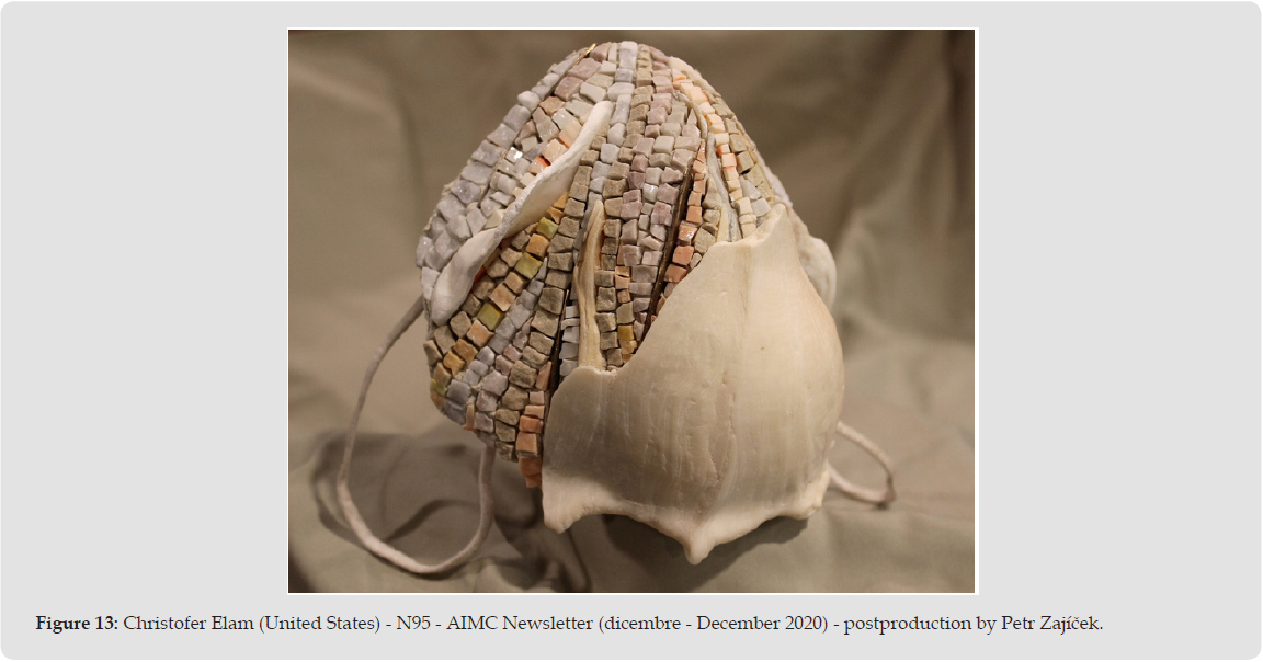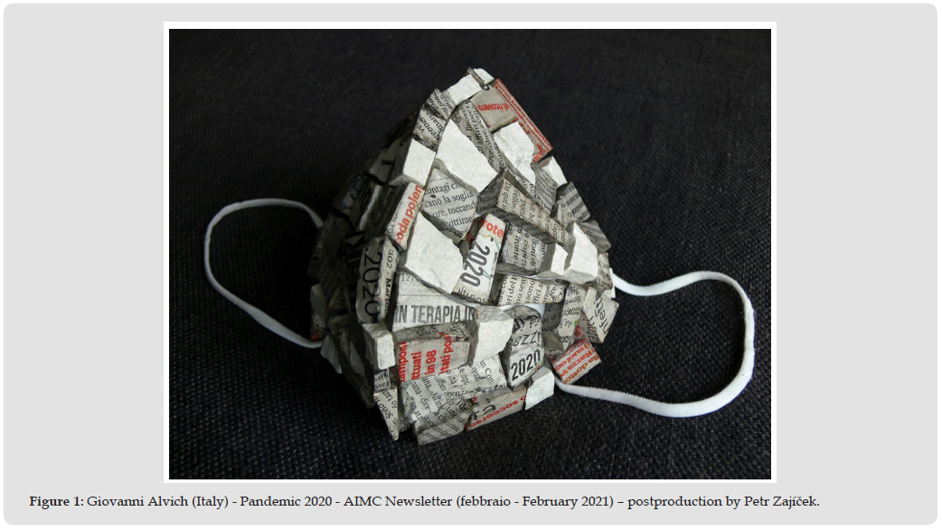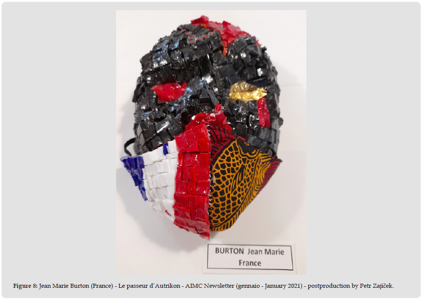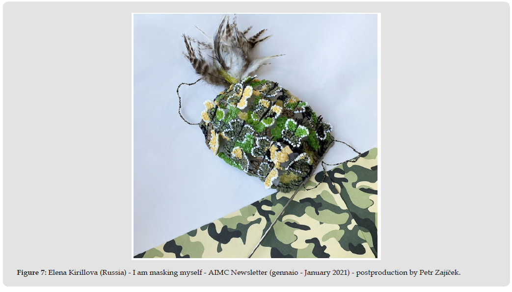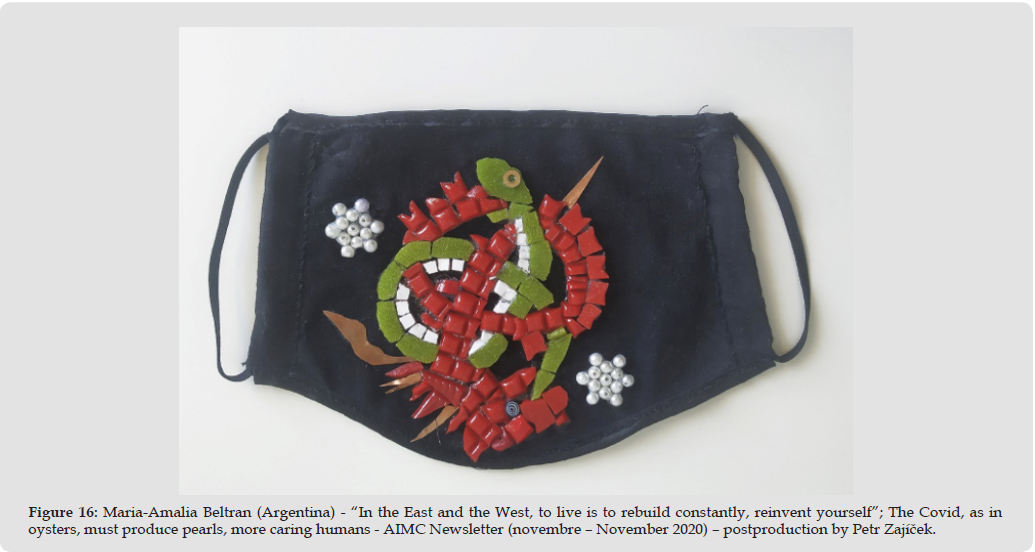 The AIMC organised the project entitled Mascherine volanti (Flying Masks). This study brings examples of work by art of mosaic creators that speak for themselves. The author of this study would like to remark the following as regards the Mascherine volanti project: it is a systematic or even system reaction of a prestigious association of visual artists suggesting that the AIMC may have been aware of the privileged position of the art of mosaic with regard to artistic expression of the COVID-19 pandemic. At the same time, mosaic creators decided to focus on the topic of the face mask; they focused on the topic of communication, the issue of words and silence, as if the meaning of the COVID-19 pandemic was concealed in this specific aspect. As artist is aware that while things unfold in a certain way on the outside, their overall meaning, some decisive second plan is present in the background. The background of the COVID-19 pandemic seems to have involved the issue of dynamics of words and silence, the impossibility of silence in the current world and therefore the subsequent impossibility of words. It is also important that the AIMC did not leave the real world behind in its activities, did not depart into the cyberspace; it continued in its original creation in-situ, even magnifying this work without resorting to recycling and re-adapting past works.