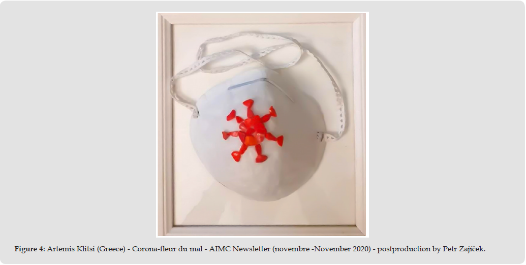 c) Despite this, the COVID-19 pandemic as a dramatic historical event had the potential for inspiring arts as such. For example, the conducted research pointed out the unique artistic project entitled Wearing Mask (Gillian Wearing, 2021), or the interesting ¨play on words expressed in an image under the title “Coronavirus (Coronavirus Has Infected this Masterpiece)” (Kamille Lukrecija Lukosiute, 2020) [16] (Figures 1-8).