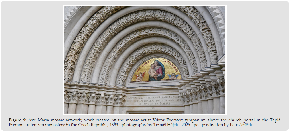 b) Specific monumentality of mosaic artworks as tension between decorativeness and inner symbolic effect: “No mosaic work with architectural adjustment can have a purely decorative impact due to the materials used to create mosaics, even if it had been designed and created for this very purpose. Materials used to create mosaics always force the work to exceed the function of a purely external ornament and become art. This is the outcome of the two previously mentioned principles: gradual emanation of light from the depth of mosaics reminiscent of the emanation principle in the hierarchy of being in Neoplatonism, which confirms the eternity of mosaics. The art of mosaic is usually unable to depict a live psychological detail in motion the way, for example, oil paintings of frescos can. Mosaic images may be rigid, static, similar to icons. However, this brings them close to symbolism, which is also static but exceptionally capable of expressing psychological and metaphysical depth [34].”