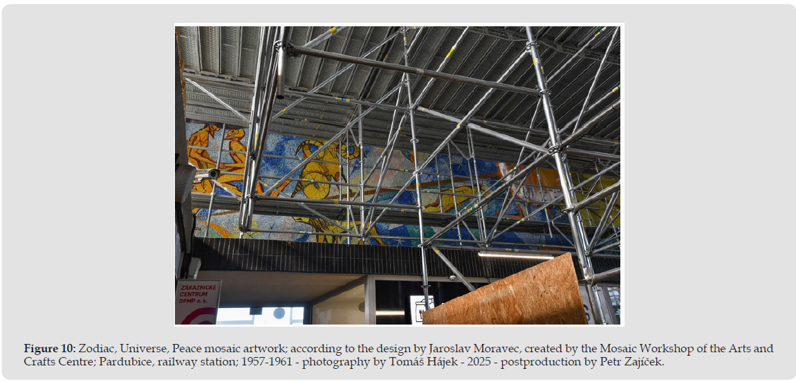 a) Specific monumentality of the art of mosaic as permanency of the artwork: “Mosaic artworks have been associated with permanency since the ancient times and are a metaphor for eternity of artwork. From the technological point of view, they are free – for example unlike oil painting (yellowing, darkening, altered refraction in linoxyn) – of an encoded inner mechanism of destruction, unless they are exposed to great moisture or are affected by major technological defects (for example the use of plaster in harsh conditions, the use of potash glass in tesserae exposed to external environment [34]”.