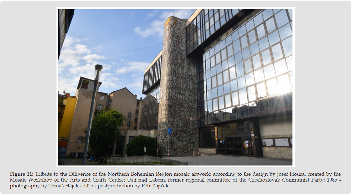 However, if a mosaic is “das gewollte Denkmal”, what does it celebrate? It may not have been the case in cobble or stone mosaics, but mosaic artists using glass in wall mosaics celebrate eternity in the sense of Platonist eternal idea, as well as biblical eternity. If the art of mosaic is always to some extent “das gewollte Denkmal” celebrating eternity and a metaphor for eternity, it is only natural that it can become ideological. The colossal character of ideological mosaics during the Cold War era is often striking. Buildings in particular from the second half of the 20th century are often demolished in Central Europe, and this frequently (save for certain exceptions) leads to destruction of interior and exterior mosaics. While some mosaics from the time of socialism are highly ideological, many of them have undisputed (great or less significant) artistic value, such as the mosaics in Prague underground. This lack of interest in destruction of mosaic artworks among general public shows that perhaps curious thought process has led to the notion that since the art of mosaic can be easily used for ideological purposes, it cannot be art and can only be an ideological ornament. The art of mosaic is therefore suppressed deep in artistic unconsciousness, and the art of mosaic is forgotten. This development occurred in Czechia in the 1990s, but the same development can repeat practically anywhere, because it is caused by the specific character of monumentality of the art of mosaic [37]. This potential for double character of monumentality in the art of mosaic, i.e. including ideological decorativeness, can be naturally observed also in Italy, the heart of the world’s art of mosaic, for example in the mosaic image “Pozzuolo del Friuli” created by Scuola Mosaicisti del Friuli between 1956-1979 [38].