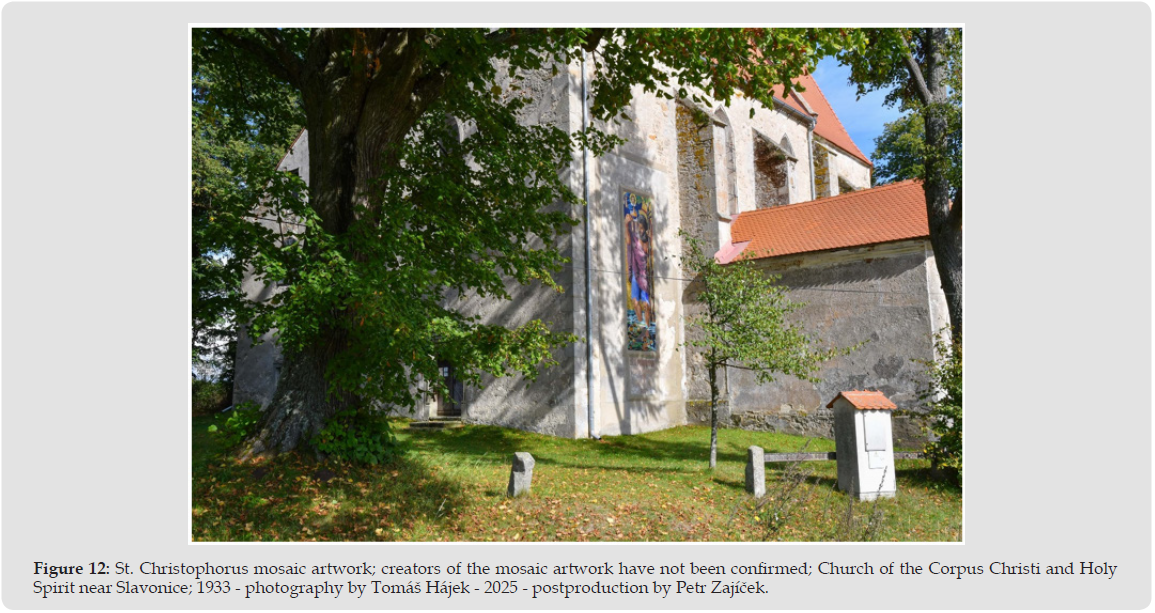 f) The author of this study considers the option that monumentality of exterior mosaic work may stem from its placement as a solitaire on a building in an open landscape to be important and worth discussing. Building on his previous work to some extent [39,40], the author focused on this topic in his lecture Due opere dimenticate di mosaico vetroso nella regione della Boemia meridionale (Two Nearly Forgotten Glass Mosaic Works in South Bohemian Region). The author would like to quote the abstract of the lecture as published in the conference catalogue: “In 2011 and 2012 South Bohemian Region Authority commissioned the author of this paper a study to analyse glass mosaic works on the territory of South Bohemian Region. Within these surveys two undoubtedly interesting mosaic works were discovered and analysed by non-destructive methods. Mosaic work depicting larger-than-life St. Christopher is a part of the pilgrimage church of St. Body and Spirit in Slavonice, a significant architectural solitaire in the landscape. This masterpiece from the early decades of the 20th century with its character completely defies Czech tradition as it began to take shape in the late 19th century. But even more interesting for the general aesthetics of the mosaic is a completely intimate character; despite its monumental size it is almost hidden to eyes of the visitors on the completely visually insignificant side wall. It presents itself in a clash of monumentality and introspection; but the introspective monumentality can be regarded as a significant feature of the general aesthetics of mosaic works at all. The second dealt mosaic work points out to what all the mosaic works can be. The Head of Christ in a medallion with a diameter of 0.7 metres above the portal of the Church of the Holy Trinity above the village of Lnáře made by the technique of glass mosaic is an absolute rarity in this area, because there are no other mosaic works there. The author of the mosaic is unknown. No sources refer to this mosaic work, despite the fact that the mosaic is in excellent condition with no traces of rust. This modest secluded mosaic work reminds in historic Czech lands omnipresent minor exterior architecture (for example calvaries or wayside boundary stones) radiation. Not great history, steeped in great stories and symbols, but the silent drama of almost anonymous everyday life reports in this church mosaic conclusively [41] (Figures 9-12).