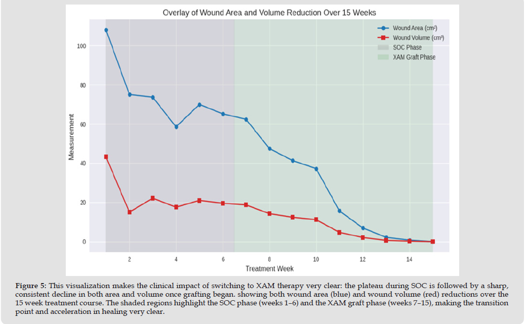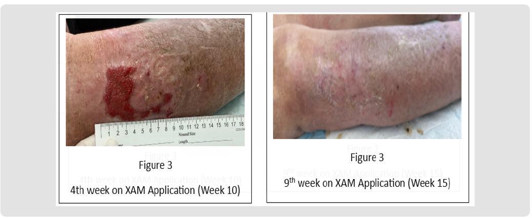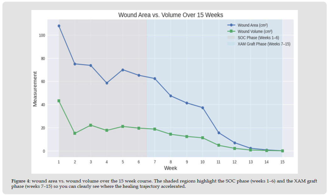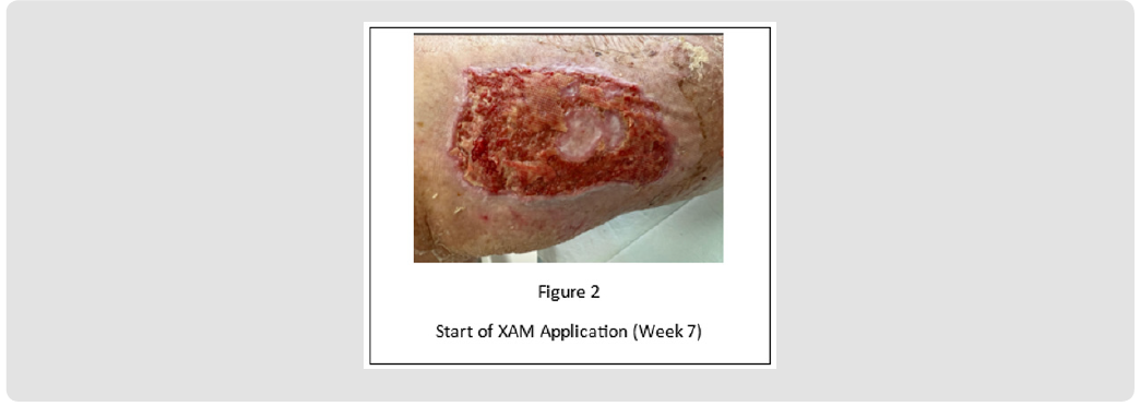 • XAM therapy (weeks 7–15): rapid and consistent reduction in wound area and volume