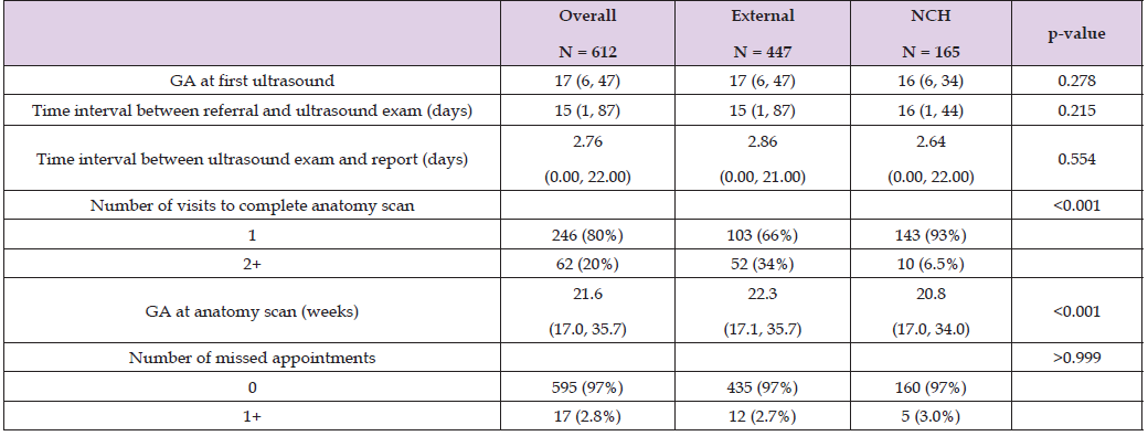first ultrasound, time from referral to ultrasound, exam reporting time, number of visits to complete anatomy