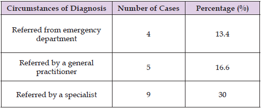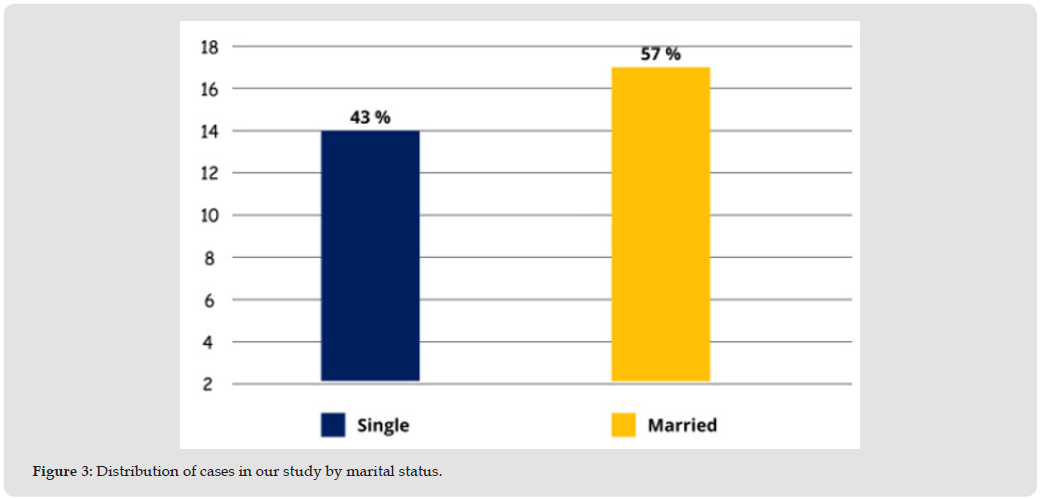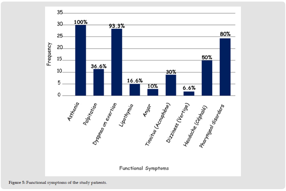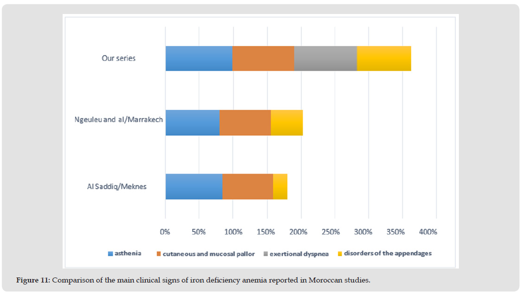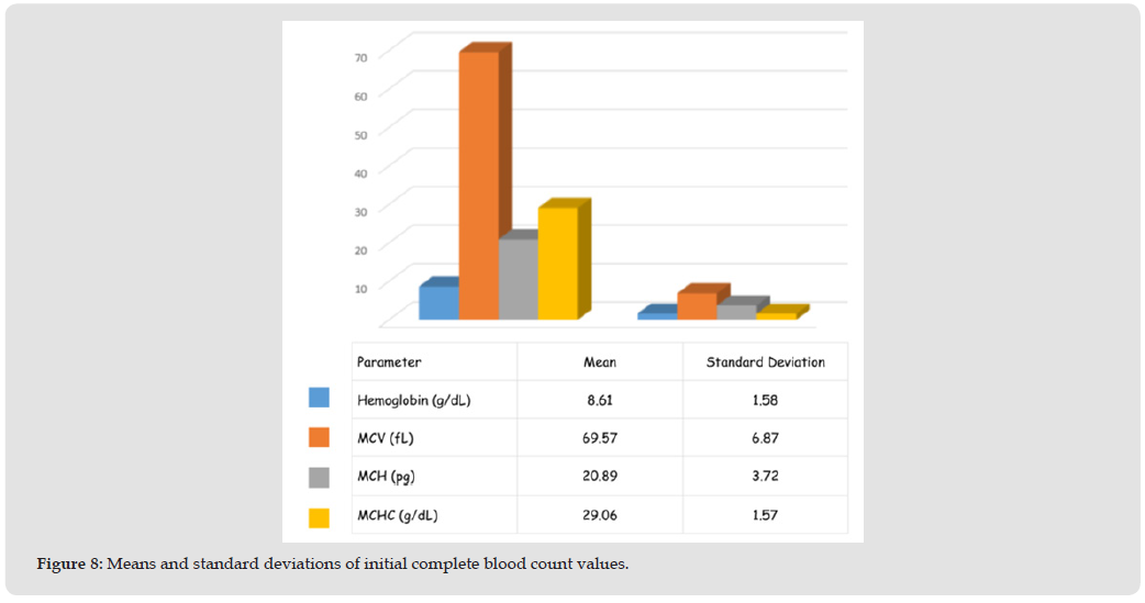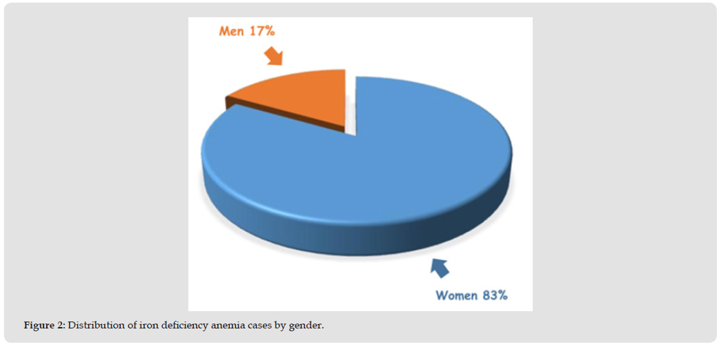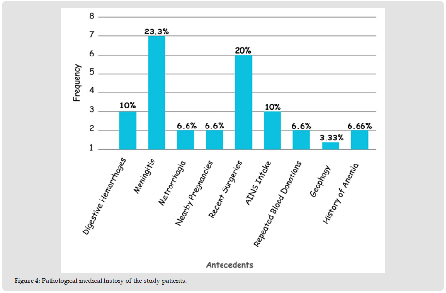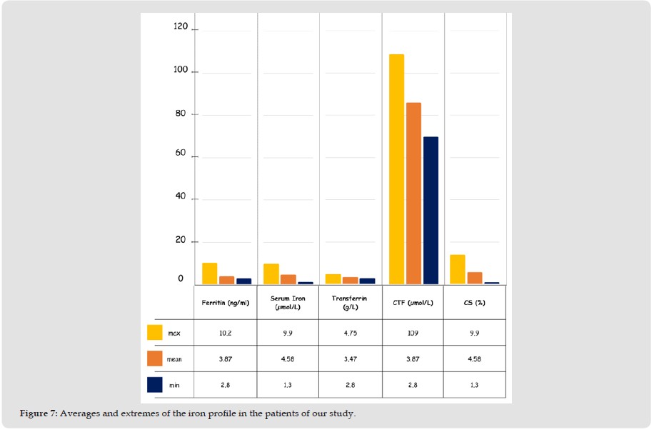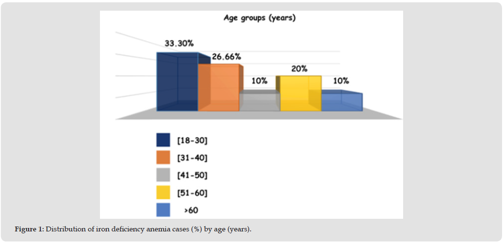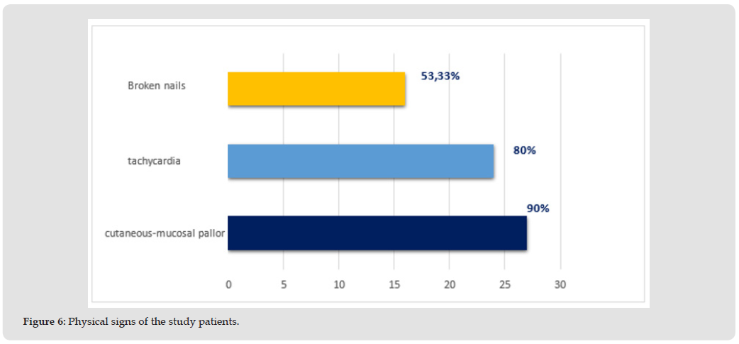 The mean age of the patients was 40.56 ± 17.45 years (Figure 1). Women accounted for the majority of cases (83%, 24 cases), compared to 6 men (17%), with a male-to-female sex ratio of 0.25 (Figure 2). Among the women, 67% were of childbearing age and 16% were menopausal. Maritally, 57% of patients were married and 43% were single (Figure 3). The majority came from urban areas (77%), compared to 23% from rural areas. Clinically, anemia was most often discovered during a routine check-up (40%), followed by referrals from a specialist (30%), a general practitioner (16.6%), or via the emergency department (13.4%) (Table 1). The medical history was dominated by menorrhagia (23.3%), followed by recent surgery (20%), digestive bleeding, and NSAID use (10%). Metrorrhagia, repeated blood donations, closely spaced pregnancies, and a history of anemia each accounted for 6.6%, and geophagia for 3.3% (Figure 4). The main functional signs reported were dominated by fatigue, exertional dyspnea, phanere disorders, followed by headaches, palpitations, tinnitus, exertional angina, and dizziness (Figure 5). Physical signs were dominated by cutaneous-mucosal pallor, tachycardia, and brittle nails (Figure 6). Biologically, the mean hemoglobin level was 8.61 g/dL, MCV 69.57 fL, MCH 20.89 pg, and MCHC 29.06 g/dL (Figure 7). The reticulocyte count ranged from 24,400/μL to 112,000/ μL, always <120,000/μL. The mean Ret-He was 20.89 pg, below 28 pg in all patients. The iron workup showed a mean ferritin of 3.87 ng/ mL, serum iron of 4.58 μmol/L, transferrin of 3.47 g/L, TIBC of 86.06 μmol/L, and SC of 5.74% (Figure 8).