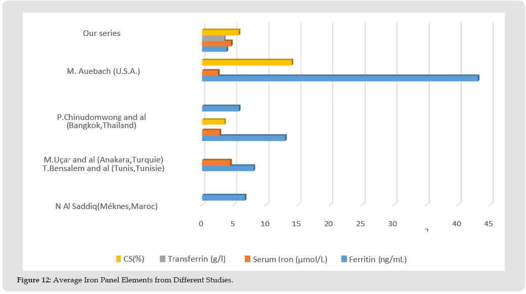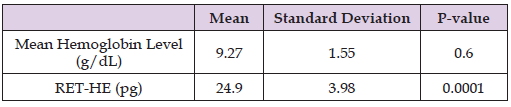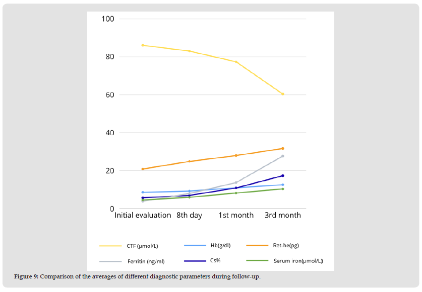 Regarding evolution, Ret-He proves to be an early and predictive marker of therapeutic response. (Uçar, et al. [3-4]). reported high specificity (90–96%) and comparable sensitivity for this parameter. According to Uçar, the absence of a difference in Hb value on the 5th day is compensated by an early elevation of Ret-He, reflecting a rapid medullary response to iron supplementation. Auebach also showed that the initial Ret-He value predicted the Hb response after IV treatment. In our series, the 3-month follow-up confirmed the prognostic value of Ret-He. As early as the first week, the increase in Ret-He was significant (p=0.0001), preceding that of Hb. Ferritin did not increase significantly until after the first month, confirming that Ret-He, which evolves in parallel with reticulocyte production, is an earlier indicator of therapeutic response (Figures 9-12) (Tables 7-10). Our study is among the first to have followed the evolution of Ret-He over 3 months, in comparison with standard iron workup parameters [5- 29].