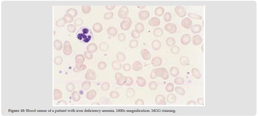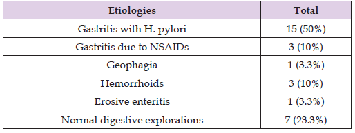 In our cohort, fatigue 100%, exertional dyspnea 93.3%, pallor 90%. Hematological results show a mean Hb generally between 7 and 9.6 g/dL depending on the series; in our series, the mean Hb value was 8.61 ±1.58 g/dL, MCV 69.57 fL, MCH 20.89 pg. Ret-He varies between ≈20 and 27 pg; in our series, the mean Ret-He value was 20.89 pg, comparable to that reported by (M Uçar, et al. [3-4]). The diagnostic performances of Ret-He reported in the literature are generally high. Biochemically, the iron workup showed a mean ferritin of 3.87 ng/mL, serum iron of 4.58 μmol/L, transferrin of 3.47 g/L, TIBC of 86.06 μmol/L, and SC of 5.74%. These results are consistent with national and international literature data. Etiologically, digestive and gynecological causes remain predominant. Studies report 48–64% digestive causes and 25–55% gynecological causes, while a proportion of cases remain without specified etiology. In our series, digestive causes were predominant (76.6%), dominated by H. pylori gastritis (50%), followed by gynecological causes (33.1%), mainly functional menorrhagia (13.3%), confirming the link between H. pylori infection and iron deficiency documented by other studies. Therapeutically, management modalities vary according to studies. Some authors recommend the administration of ferric carboxymaltose intravenously (1 g in 1 to 2 infusions), others recommend IV iron-sucrose, while oral treatment remains a preferred alternative in moderate forms. Our approach (oral treatment with 3-month follow-up) is similar to some Indonesian and Turkish series.