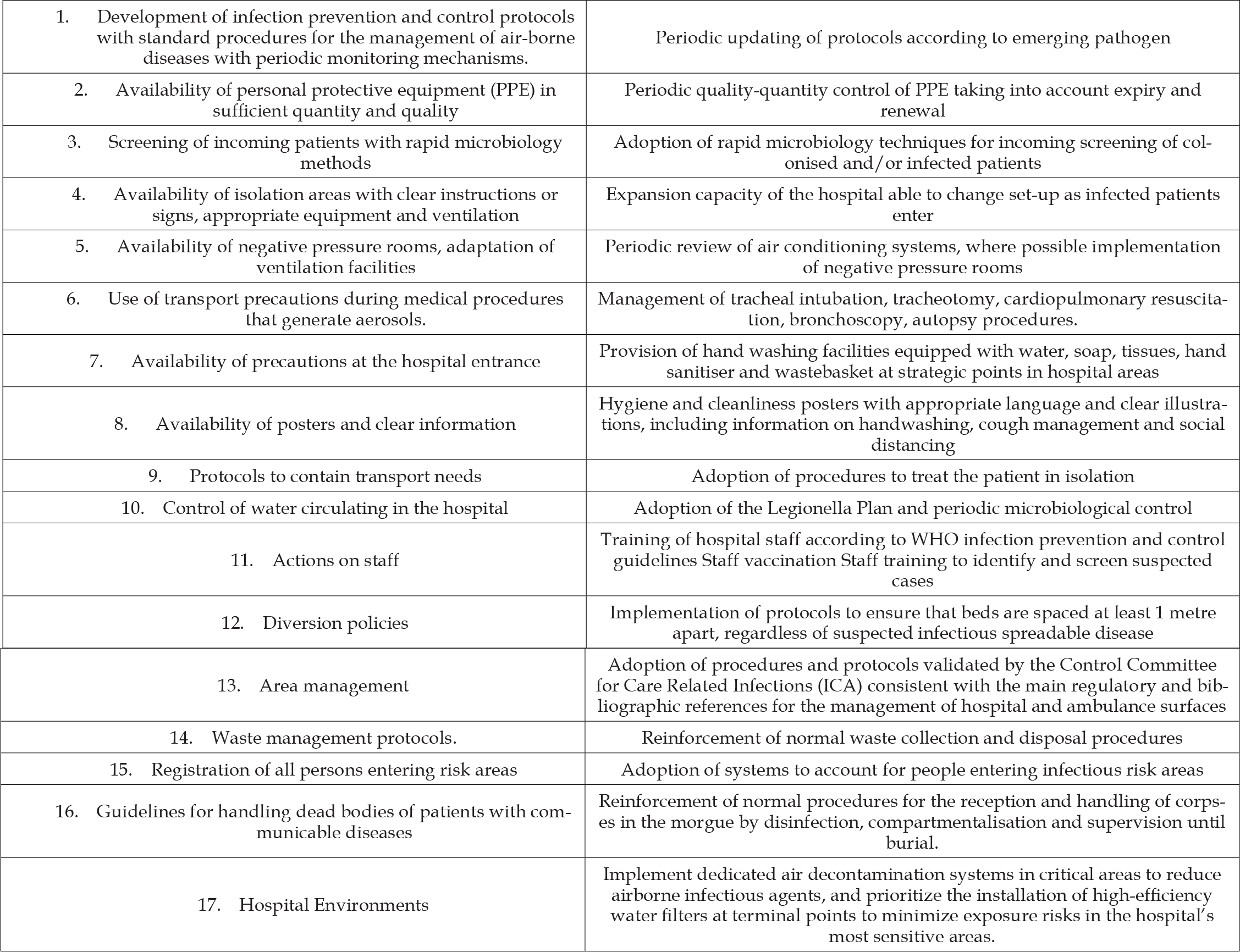 In conclusion, the prevention of epidemic events and the spread of airborne infectious diseases in hospitals requires a multi-modal approach that integrates cleaning, disinfection, infection control, appropriate - PPE, constant monitoring, rapid microbiology, staff training and contingency planning. It is crucial to implement these measures rigorously and systematically to protect the health of patients and healthcare workers. Recently it should also be noted that for most of the safety measures indicated in this article, a technical approval opinion has been issued concerning the technical-scientific profile and its correlation with current legislation by the Ministry of Health. The ability to use innovative techniques based on validated documentation and legislation allows the circulation of pathogens to be minimised and is a valuable defence argument in the event of medical-legal litigation.