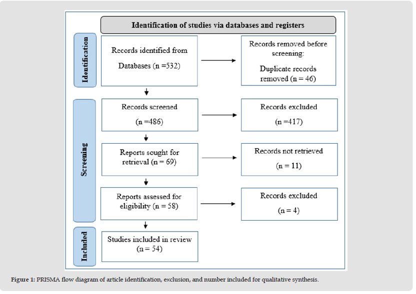 Following a pilot test, titles and abstracts assessed by two researchers to ascertain their relevance to the study’s objectives, focusing on English-language studies with broadly applicable contributions. Consequently, 69 articles retained, with 417 recovered (see Figure 1). The same reviewers meticulously examined the full texts of the selected citations, making decisions based on their alignment with the study’s objectives. After this thorough review, 16 articles excluded because of the full text evaluation, leading to the inclusion of 54 articles in the qualitative synthesis [22-24].