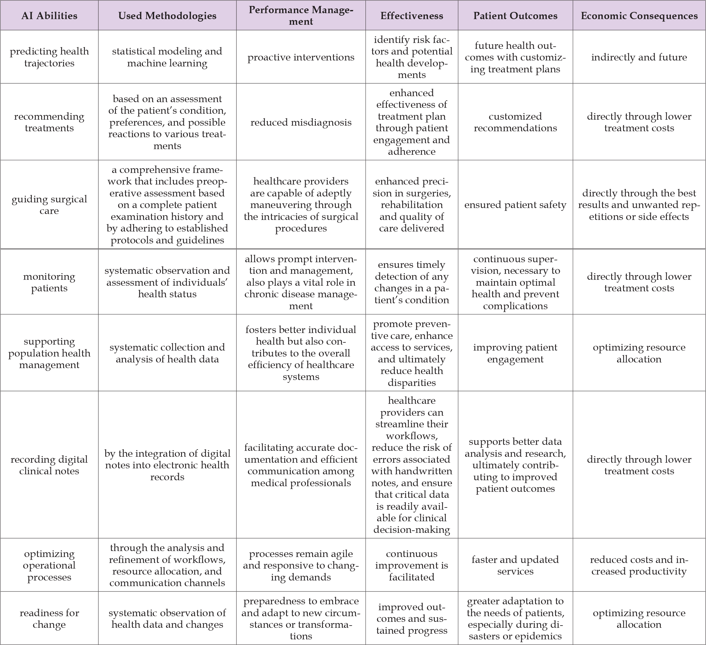 Obviously, a healthier population fosters a more efficient workforce, promoting economic development and decreasing public expenditure on medical services, thus contributing to reducing transaction costs, fewer complications and improving the efficiency of services [31,59-63]. Table 2 comprehensively illustrates the methods in which AI is transforming performance management, promote effectiveness, improving patient outcomes, and promoting positive economic effects for healthcare systems.