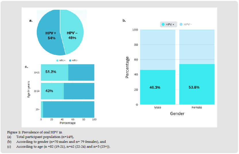 Prevalence of Oral HPV A total of 149 participants with a mean age of 21.6 years (19-46 years) and 53% (n = 79) female enrolled for oral HPV prevalence testing. 96.6% of the participants were aged between 19 and 24 years of age with only five participants aged 25 years and older. In this cohort of predominantly healthy young adults, 54% (n = 80) tested positive for any oral human papillomavirus (HPV) (Figure 1). Prevalence was higher in females with 53.8% (n= 79) testing positive for oral HPV infection when compared to 46.3% (=70) of the male participants. Oral HPV infection tended to be higher in the younger participants with a frequency of 51.2% in the 19- to 21-year-old age group compared to the 22 to 24 age group (43%) and the 25 and older age group (3.8%).