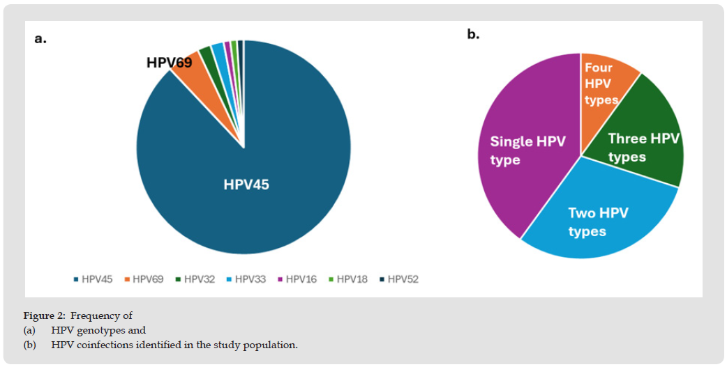 In addition, the overwhelming burden of oncogenic genotypes (95.5%) in our study population is more pronounced than other comparative global settings, which may reflect selective pressures or transmission dynamics that favour high risk types in this study population. Given that persistent oncogenic HPV coupled with other risk factors like smoking, alcohol consumption, oral hygiene and immune status drive carcinogenesis; it becomes crucial to investigate these risk factors in these same student populations as well as persistent of infection to enable understanding of the level of risk amongst these young adults. Once risk is understood appropriate prevention measures can be initiated. A major preventive measure instituted by the Government of Zimbabwe is HPV vaccination of prepubescent girls aged 9-14 initiated in 2018. It is believed and has been established that vaccination indeed reduces prevalence of HPV infection [8]. However, HPV vaccination has been pushed for cervical cancer leaving many unaware of HPV infection in other anatomical sites and the benefits of vaccination. In addition, Zimbabwe’s current vaccination programs predominantly use the bivalent (HPV-16/18) or quadrivalent (HPV-6/11/16/18) vaccines. These do not offer protection against HPV45, the most prevalent genotype in this study. These findings, therefore, support the introduction of the nonavalent vaccine (which includes HPV45) and advocate for broader, genderneutral vaccination strategies that include tertiary education students.