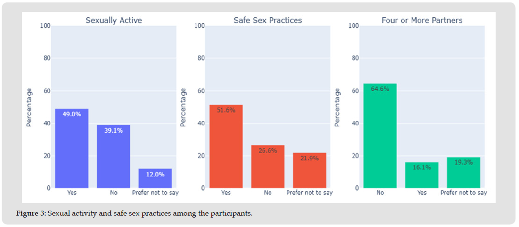 HPV 45 was the predominant genotype in this cohort, detected in 77 cases and accounting for approximately 87% of all genotypepositive samples, while other types including HPV 16 (n=1), HPV 18 (n=1), HPV 31 (n=2), HPV 33 (n=2), HPV 52 (n=1), and HPV 69 (n=4) being observed infrequently (Figure 2). Among participants, 95% of HPV-positive cases involved a single genotype and only 4% had multiple-type infections (2.7% dual, 0.7% triple, 0.7% quadruple or more). A total of 192 participants responded to the questionnaire. Respondents had a mean age of 22 years (19-45 years old) with 89.6% aged 19 to 25 years of age. Females made up 53.1% of the student respondents. Of these participants, 49% were sexually active (Figure 3) whilst 12% preferred not to divulge sexual activity. Of the sexually active participants, 51.6% claimed to practice safe sex including frequent condom use whilst 16% of the sexually active had had four or more sexual partners. Knowledge of HPV being a sexually transmitted infection was high amongst the general student body with 84.9% confirming HPV as a sexually transmitted infection (Figure 4). However, only 68.8% of the student respondents were aware that HPV causes cancer, whilst only 32.3% believed condom use was effective in reducing HPV infection. Only 14.6% of the respondents were vaccinated against HPV (Figure 5). 49% of the respondents believed the vaccine was safe whilst only 46.9% believed the vaccine was effective.
