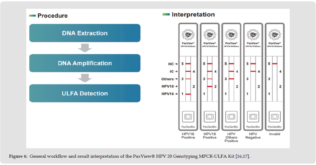 HPV Analysis: Prior to PCR, reagents were thawed at room temperature or on ice for 10–15 minutes, depending on reagent specific requirements, the mixed, and briefly centrifuged. A master mix consisting of 10 μL of 2X PCR premix and 5 μL of primer mix (15 μL total) was prepared in 0.2 mL PCR tubes, to which 5 μL of extracted DNA, positive control, or negative control (distilled water or TE buffer) was added. PCR amplification was conducted using a TECHNE TC-412 thermal cycler (Bibby Scientific Ltd, Stone, United Kingdom) with the following cycling conditions: 50°C for 4 minutes (1 cycle), 95°C for 10 minutes (1 cycle), followed by 25 cycles of 95°C for 15 seconds and 72°C for 90 seconds, and then 20 cycles of 95°C for 15 seconds, 62°C for 45 seconds, and 72°C for 30 seconds. Post-amplification, 5 μL of PCR product was loaded into the upper slot of a ULFA cartridge, followed by the addition of 50 μL of running buffer into the lower slot. After 5 minutes, 50 μL of washing buffer was added to the lower slot. Results were interpreted within 10 minutes using a ULFA reading film as instructed by the manufacturer.