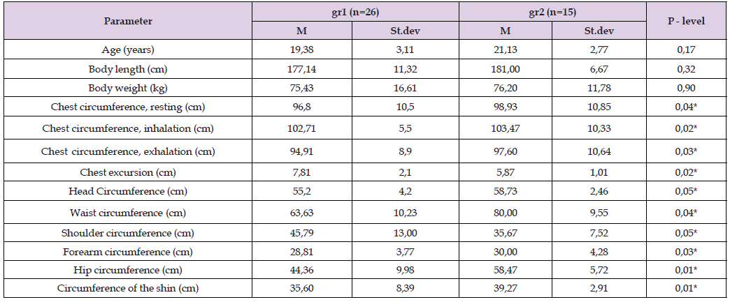 6. Cooper test (12-minute smooth run under standardized track and field arena conditions); VO2 max = (D12 - 504.9)/44.73, where D12 is the distance in meters covered during the 12-minute test. The results of own research According to sociological research (questionnaires, interviews), all athletes from the Russian Federation (gr1) actively participated in competitions and noted high sporting achievements: 1st place at the World Championship - 1 person (3.84%), European Champions - 1 person (3.84%); champions and prize winners of the Russian Sambo Championships - 5 people (19.23%); champions and prize winners of All-Russian competitions - 5 people (19.23%); champions and prize winners of the city of Moscow and the Moscow region - 46.15% winners and prize winners of the championships of Yakutia, the Far East and Dagestan - 7.69% (2 people). Among martial artists from the China (gr2), prize winners and champions of the the China championships - 53.33% (8 people) of athletes took part in physiological testing; Champions of Henan, Hainan, and Jiangxi Provinces in China – 33.33% (5 people); champions of the Sanda Youth Games in China – 13.33% (2 people). Athletes – martial artists from the Russian Federation report a history of musculoskeletal and central nervous system injuries in 76.47% (20 people), sustained as a result of falls on the mat and during attacking and counterattacking techniques. No sports injuries reported in 15.38% (4 people).