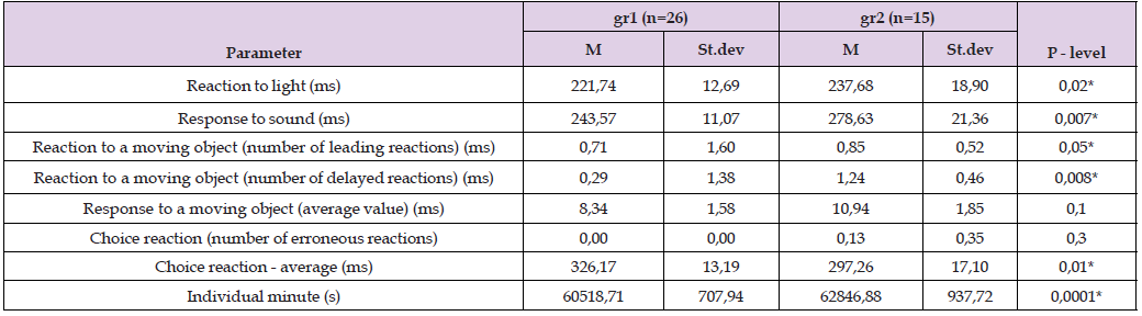 3. Psychophysiological testing conducted using “The Researcher of human spatio-temporal properties” 2.1 computer program (Koryagina Yu.V., Nopin S.V. (2001-2003)). Athletes completed tests assessing reflex responses to biologically significant stimuli: light, sound, moving object, choice reaction time (ms), and individual minute time (s).