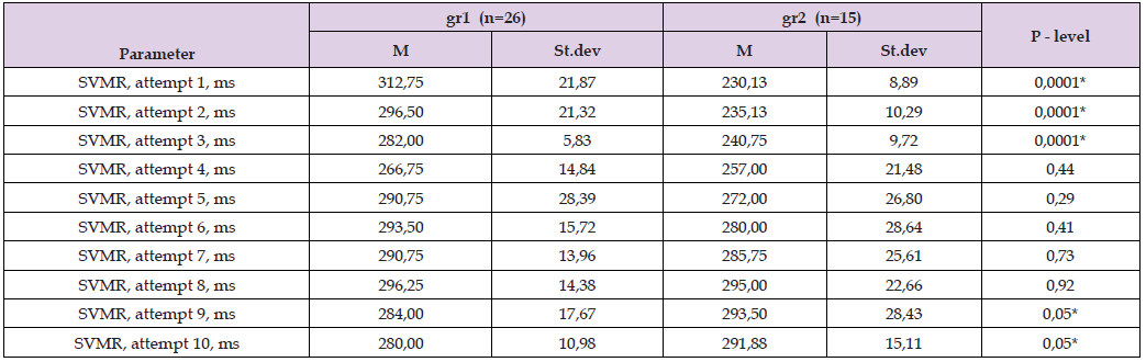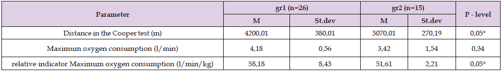 Russian combat athletes report high speed in completing tasks on the Mental Performance Test with the highest cognitive load, noting a high degree of reliability in differences (gr1-gr2 at p<0.01). The average speed for completing the Mental Performance Test in Gr1 was 950.00±191.49 (ms); the average speed for completing the Mental Performance Test in Gr2 was 1125.00±103.51 (ms). The Simple Visual- Motor Response test is the most informative test for identifying differences between comparison groups. The results of the Simple Visual-Motor Response test for combat athletes from Russia and China presented in Table 3. The data presented in Table 4 confirm the rapid fatigue response of martial artists from the People’s Republic of China during psychophysiological testing involving a series of stimuli. Significant differences identified on the 1st, 2nd, and 3rd attempts with the highest reliability (gr1 – gr2, at p < 0.0001). However, martial artists from the Russian Federation were more resistant to fatigue in the SVMR test, as demonstrated by the results of the final attempts. Aerobic endurance indicators for athletes from the Russian Federation and Sanda fighters from the People’s Republic of China obtained using the Kenneth Cooper test. The results of the Kenneth Cooper test performed by martial artists from the Russian Federation and the People’s Republic of China presented in Table 4.