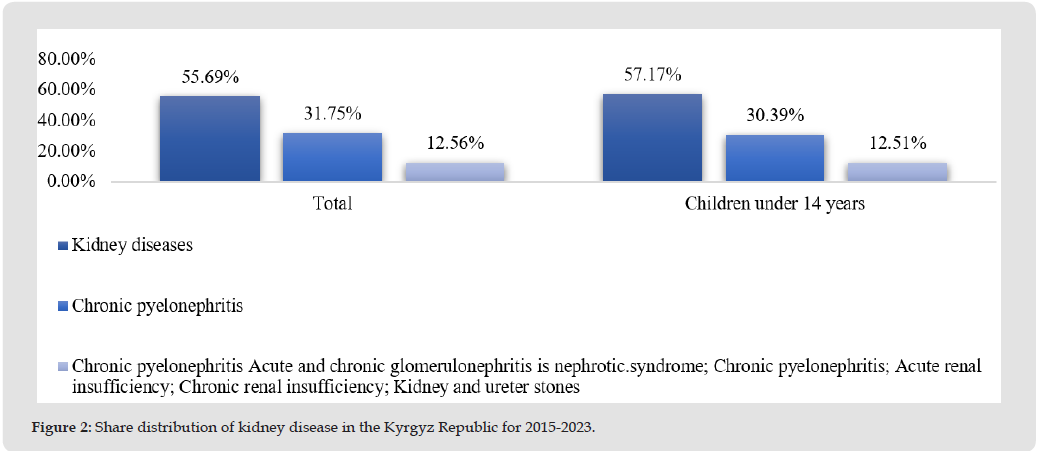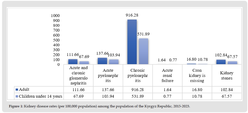 In the state reporting form on morbidity in the Kyrgyz Republic, the structure of kidney diseases includes 6 nosological forms, of which the first place in terms of prevalence is occupied by chronic pyelonephritis with an incidence rate of 916,280/0000 in adults and 531,890/0000 in children under 14 years of age. The incidence rate of acute pyelonephritis is 137,660/0000 in adults and 103,940/0000 in children under 14 years of age. Acute and chronic glomerulonephritis among adults is - 111.66 and in children under 14 years is 67.690/0000, the same incidence rates of “kidney and ureter stones” at 102.840/0000 and 67.570/0000 are observed in adults and children under 14 years respectively. The incidence rate of chronic kidney diseases - 16,800/0000 in adults and 10,780/0000 in children under 14 years of age and occupies a special place among chronic non-communicable diseases as it leads to drastic deterioration in quality of life, high mortality and in terminal stage, the need for expensive methods of replacement therapy - dialysis and kidney transplantation. Detailed data on kidney diseases are presented in Figure 1. According to the study Global Burden of Disease 2010, diseases of the genitourinary system, including chronic kidney disease ranked 27th in the list of causes of total number of deaths in the world in 1990, that is, the age-standardized annual mortality rate was 15.70/0000, but in 2010 the annual mortality rate was 16.30/0000 taking the 18th place, that is, the degree of movement up the list is second only to HIV and AIDS (Jha V, et al. [19])].