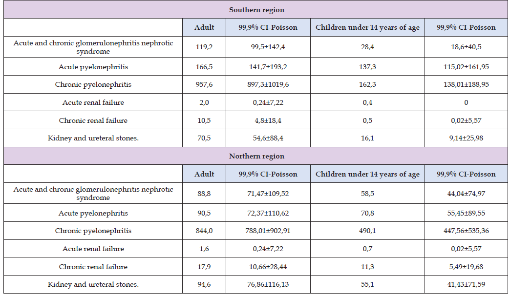 In the Kyrgyz Republic, kidney diseases are an urgent problem leading to deterioration of the quality of life, high mortality and in the terminal stage - to the need for expensive methods of substitution therapy - dialysis and kidney transplantation. The leading prevalence of chronic pyelonephritis with (916,280/0000 in adults and 531,890/0000 in children under 14 years), acute and chronic glomerulonephritis among adults is - 111,66 and in children under 14 years - 67,690/0000, as well as kidney and ureteral stones and the chronic kidney disease are 102,840/0000 and 67,570/0000 and - 16,800/0000and 10,780/0000 respectively. The mortality rates for the southern region were -19.70/00 and for the northern region 30.60/00, significantly more deaths are observed in the female population in the northern region compared to the southern region-mortality rate of 21.2, amounting to 34.20/00, when recalculated per 100,000 population, this rate would be 342 deaths among the female population per year. In the northern part of the country, the social burden of this pathology is 1.5 times higher than in the south. Despite the relatively low level of registered cases of chronic kidney pathologies - 12.6%, per 1000 us. - 1260/00, there is a significantly high mortality rate, averaging 25.20/00, which in turn exceeds global mortality rates in general. Comparative analysis of kidney disease indicators of the population of the southern and northern regions of the republic shows that acute and chronic glomerulonephritis in 1, 3 and acute and chronic pyelonephritis in 1.8 and 1.1 times more than in the southern region.