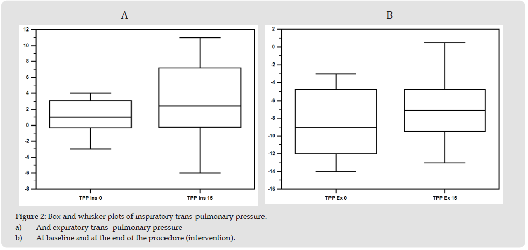 The other measures that were found to have statistically significant differences were the maximum inspiratory pressure (Peak P was 16.0±2.5 cmH2O at the beginning of the operation and 35.6±7.3 cm- H2O at the end, Pv=0.002) and the pulmonary compliance (70.5 ml/ cmH2O at a range of 56.9 to 146.8 ml/cmH2O at the beginning of the operation compared to 26.8 ml/cmH2O with a range of 21.7 to 42.3 ml/cm at the end). Inspiratory esophageal pressures were also significantly higher at the end of surgery. Comparing the measurements of the trans-pulmonary pressures at the beginning and at the end of the surgery, did not demonstrate any significant differences (Figures 2a & 2b).
