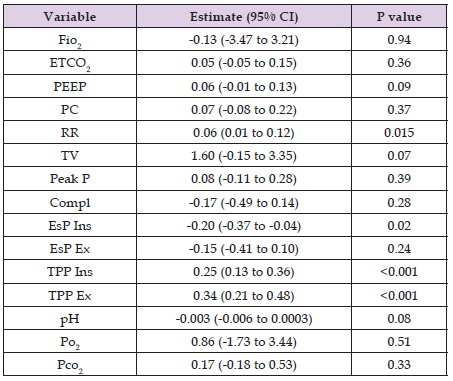 Note: Continuous variables are expressed as means (SDs) or medians (interquartile ranges) for non–normally distributed data. A paired t-test was used to compare normally distributed variables and the Wilcoxon rank-sum test was used to compare non-normally distributed variables. Fio2 – fraction of inspired oxygen; ETCO2 – end tidal CO2 (mmHg); PEEP-positive end expiratory pressure (cmH2O); PC- pressure control (cmH2O); RR- respiratory rate (breaths/minute). TV- tidal volume (ml); Peak P- peak inspiratory pressure (cmH2O); Compl- lung compliance (ml/cmH2O); EsP Ins- inspiratory esophageal pressure (cmH2O); EsP Ex- expiratory esophageal pressure (cmH2O); TPP Ins- inspiratory transpulmonary pressure (cmH2O); TPP Ex- expiratory transpulmonary pressure (cmH2O); PO2 – arterial oxygen partial pressure (mmHg); PCO2 – arterial carbon dioxide partial pressure (mmHg).