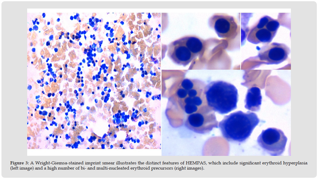 Recently he was having pain in his right knee for which he underwent a right knee MRI which was reported as “marrow proliferative disorder which may be on a benign or potentially malignant basis and clinical correlation is indicated”. Due to concerns regarding a myeloproliferative disorder and potential malignancy, a bone marrow examination was requested. This procedure was performed on the right posterior ilium under monitored anesthesia care (MAC). Unfortunately, the bone marrow aspirate resulted in a bloody tap (Figure 1A). However, the imprint (Figure 1B) obtained from the core biopsy specimen displayed characteristic features of HEMPAS (Figure 2) and did not indicate the presence of any hematological or non-hematological malignancy. Additionally, the bone marrow biopsy findings were negative for any myeloproliferative disorder or malignancy.
