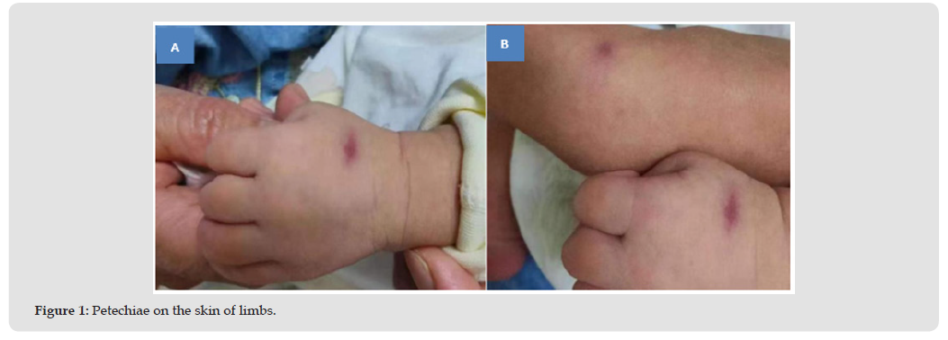 A male infant (G3P1, the other two had abortions for personal reasons), was delivered at full term by cesarean section (Surgical indications: placenta previa with bleeding). He required hospitalization on two occasions during infancy for severe thrombocytopenia and widespread subcutaneous petechiae.