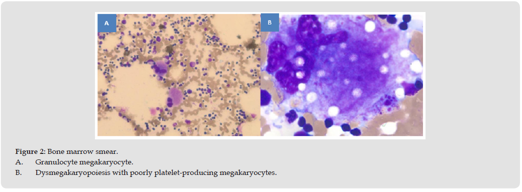 He represented with petechiae on the trunk, lower limbs, and oral mucosa (Figure 1). His platelet count had fallen to 13x10^9/L. Autoantibody testing was positive for dsDNA. A subsequent bone marrow examination demonstrated markedly hypercellular marrow with decreased platelet production by megakaryocytes (Figure 2). The combination of early onset, recurrence, and these marrow findings raised strong suspicion for an underlying inherited disorder. A second course of IVIG (1.49 g/kg) was administered, and oral prednisone was initiated (1.86 mg/kg/day), again eliciting a positive platelet response (dynamic changes of his platelet counts is shown in Figure 3). Pre