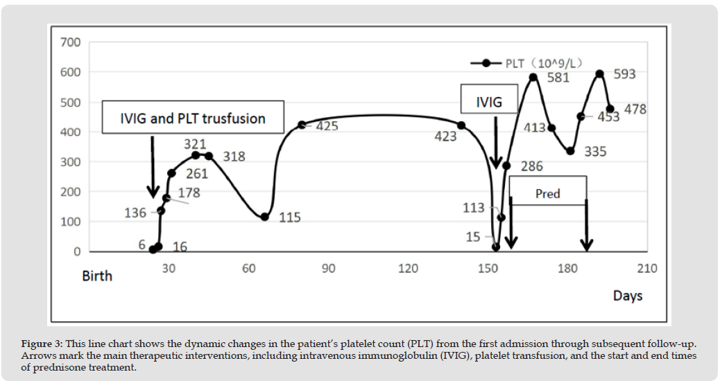 After the genetic diagnosis, we discontinued the unnecessary considering long-term immunosuppressive therapy. We shifted our subsequent management focus to bleeding risk assessment and infection prevention. Half a month ago, during a hospitalization for enteritis, the patient’s platelet count showed a reactive increase, suggesting good bone marrow hematopoietic reserve function.