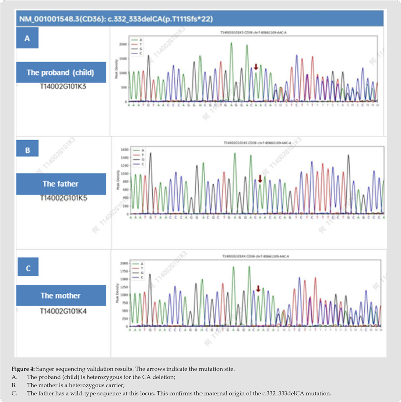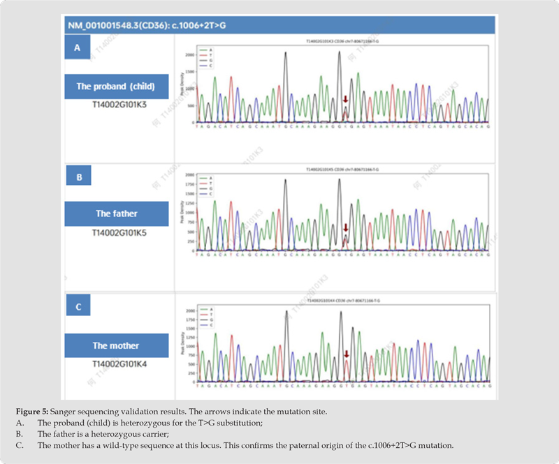 Given the early onset and recurrent clinical course, peripheral blood samples were collected from the child and his parents and sent to Kingsmed Genomics Medical Laboratory in Wuhan, China for genetic analysis. The test performed was “Enhanced Whole Exome Sequencing,” utilizing target region capture and the SURFSeq5000 high-throughput sequencing platform. Genetic analysis identified two pathogenic variants in the CD36 gene in the patient, constituting a compound heterozygous state (Figures 4 & 5): c.332_333delCA (p. Thr1115fs22), a known frameshift mutation inherited from his mother; and c.1006+2T>G, a classic splice site mutation inherited from his father. These pathogenic variants were both verified by Sanger sequencing in the family samples. This result clearly supports the diagnosis of “Platelet Glycoprotein IV Deficiency.” The splice site mutation c.1006+2T>G is particularly noteworthy. Recent haplotype analysis suggests that this mutation often co-occurs with regulatory region variants like c.-132A>C, forming a specific haplotype block strongly associated with type I CD36 deficiency [1]. This case provides another instance of this mutation forming a compound heterozygote with c.332_333delCA, enriching the genotypic spectrum of the disease.