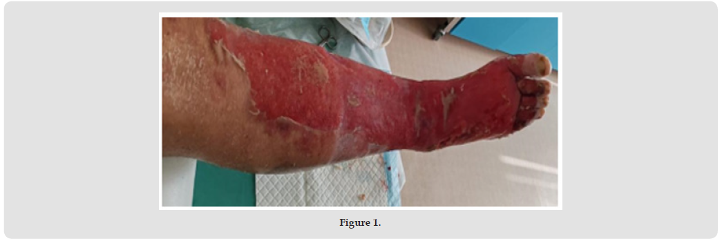 In September 2024, a 67-year-old patient was on vacation in Egypt, stating that a “lounger” fell on his right big toe. Immediately after the injury, the patient was practically without difficulty, without pain, and mobile. On October 6, 2024, he had a chill with a subsequent increase in temperature to 39.5°C, with admission to the internal department of another medical facility. An increase in inflammatory parameters was noted, highly elevated inflammatory parameters, and a slight elevation of hepatic, renal, and cardiac parameters. A finding of redness and swelling was described on the lower leg, and due to the increase in glycemia, the differential diagnosis also included the diagnosis of diabetic foot syndrome, possibly gangrene. When taking a personal history, there are no signs of serious illness, hypertension, suspected ischemic heart disease and obesity (BMI more than 40) are noted. In the wound of the right lower leg, a bacterial finding of Streptococcus pyogenes was found, the diagnosis of A46 Erysipelas was established. Due to the presence of a large bulla with hemorrhagic content near the right heel, an incision of the bulla was performed on the lateral side, evacuation of the sanguinolent content, removal of the bulla and application of a fatty truncal. During hospitalization, the patient reported dyspnea, an echocardiological examination was performed, which described a disorder of relaxation of the left ventricle, borderline left atrium and ascending aorta, small mitral and tricuspid regurgitation, trace fluidopericard-monometric and functional findings were identical, compared to the previous ones.