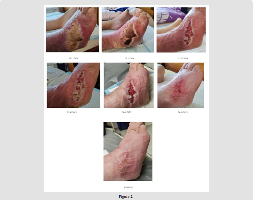 Subsequent consultation with an orthopedist was performed on 29.10.2024, 05.11.2024, 12.11.2024. At the same time, repeated debridement of the wound was performed, and repeated dressing was applied. Due to the continued increased inflammatory parameters, Clindamycin was included in the antibiotic therapy, which was sensitive to Streptococcus pyogenes due to the determination of the minimum inhibitory concentration. Due to the occurrence of yeast in the oral cavity, Medoflucon was also included in the therapy. During the entire hospitalization period, several CRP samples were taken with a gradual decrease (38.30-20.10-19.90-1.90mg/l), as well as procalcitonin (0.108-0.077-0.091-0.086μg/l). On November 14, 2024, the patient was discharged from the Infectious Diseases Clinic to outpatient care with the following recommendations: continue medication treatment with Clindamycin 300 mg 1-1-1, add probiotics, continue treatment with low molecular weight heparin. Based on the recommendation of the orthopedist, lubricate the lower leg and plantar fascia twice a day. Apply dressings (debridement with a special towel, use bioceramic covering) through the home nursing care agency, every two days. Supportive vitamin therapy remains unchanged. Continue outpatient care in the orthopedic clinic. From discharge to outpatient care to the end of treatment by the orthopedic surgeon, the patient visited the clinic 12 times between 15.11.2024 and 17.04.2025. During this care, the following procedures were repeatedly performed: debridement, bioceramic dressing, wound irrigation.