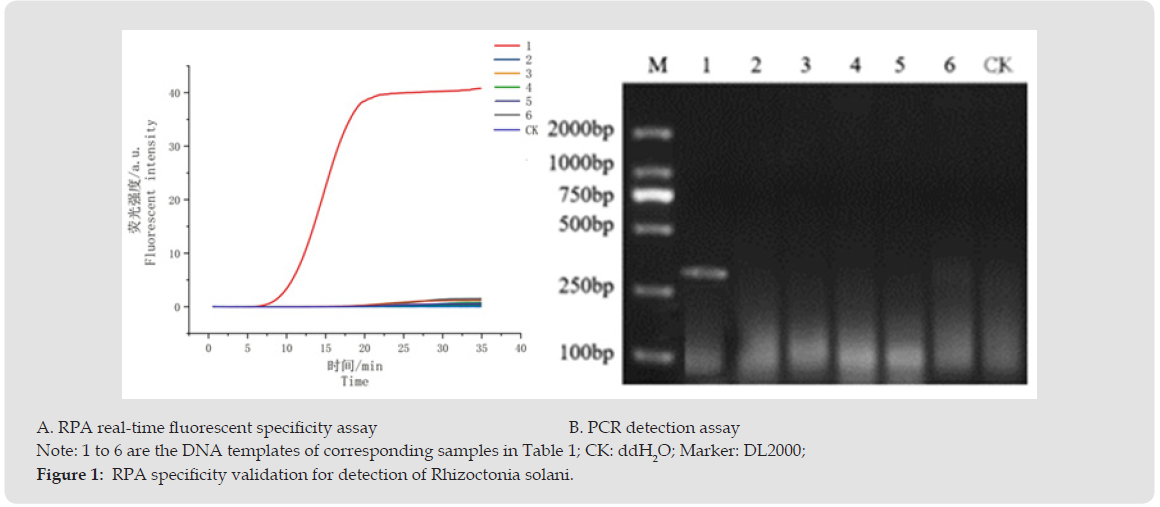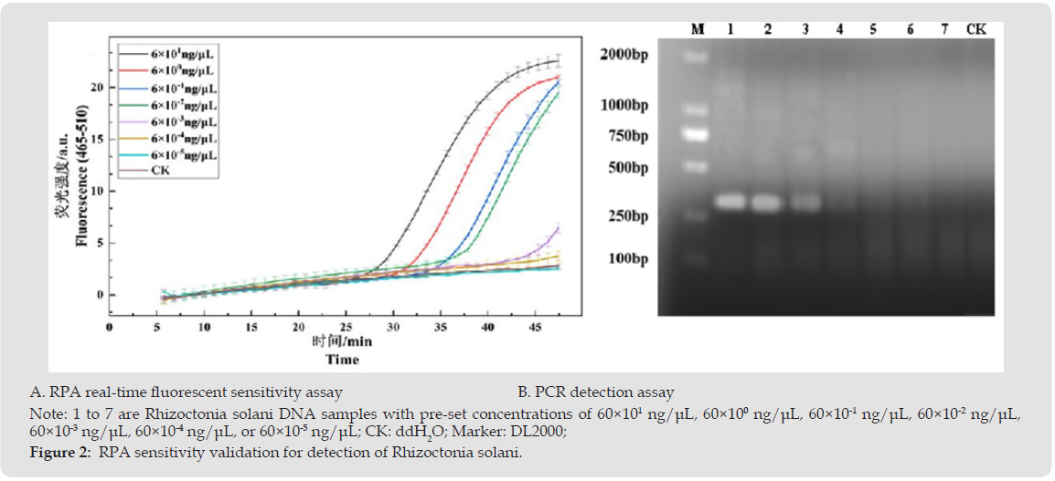 DNA templates from Rhizoctonia solani and its closely related species were selected for analysis of the detection specificity, Distilled water was employed as the negative control. The specificity was tested by both PCR and fluorescent RPA. In the sensitivity determination experiments, Genomic DNA from Rhizoctonia solani and its closely related species were serially 10-fold dilution of the initial concentration of 60 ng/μL. The results were directly examined in the UV gel system for visualization and fluorescence amplification curves.