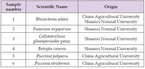Shaanxi Normal University provided Rhizoctonia solani, Fusarium oxysporum, Colletotrichum gloeosporioides penz, Botrytis cinerea, China Agricultural University provided Rhizoctonia solani, Puccinia polysora, Puccinia striiformis (Table 1).