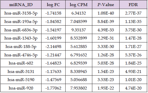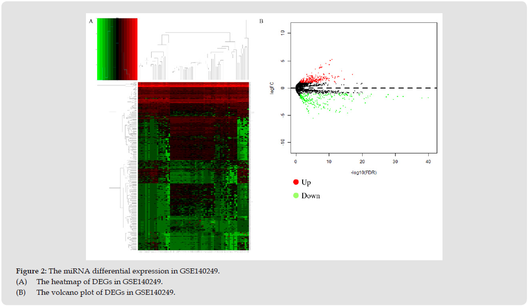 The study whole analysis process is presented in Figure 1. GSE140249 was analyzed by “edgeR” package in R with FDR <0.05 and |log2FC| > 1.5 as the threshold. In dataset GSE140249, 470 differentially expressed miRNAs (DE miRNAs) were identified, which contained 249 up-regulated genes and 221 down-regulated genes (Figure 2A & 2B). All the DE miRNAs in the datasets were respectively performed clustering and shown in the form of heatmaps (Figure 2A). The top 10 DE miRNAs in the dataset were shown in Table 2.
