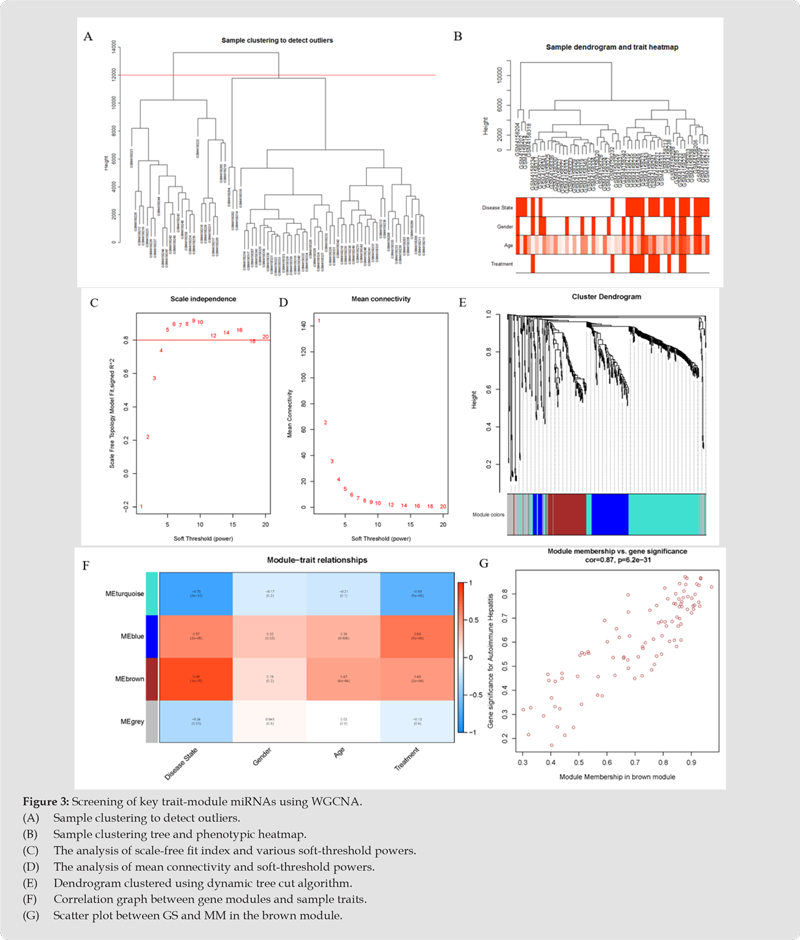 Once diagnosed with the end stage of liver cirrhosis, liver transplantation is regarded as the final treatment scheme [10]. There is an urgent need to identify new biomarkers in patients with AIH to better detect people at early stage of AIH, so that effective therapies can be used to curb disease progression. The bioinformatic analysis of miRNA/mRNA sequences draws increasing attention in non-tumor disease research recently [11]. A series of online databases and tools have contributed a lot to understanding and predicting disease development. The Gene Expression Omnibus (GEO) database freely distribute high-throughput molecular abundance data [12]. The miRbase database is a searchable database of published miRNA sequences and annotation [13]. And the miRWalk database stores experimentally verified miRNA-target interactions [14]. These databases provide access to publicly available data for researchers. Weighted Gene Co-expression Network Analysis (WGCNA), as a method to screen disease-related modules, is the most common and useful method for discovering the link between key genes and clinical characteristics [15]. The least absolute shrinkage and selection operator (LASSO) is another algorithm to obtain a more refined model by constructing a penalty function [16]. However, there are still little researches on AIH. Here, the key genes are screened by differential expression miRNAs analysis, and WGCNA combined with LASSO, in order to explore the key genes associated with AIH.