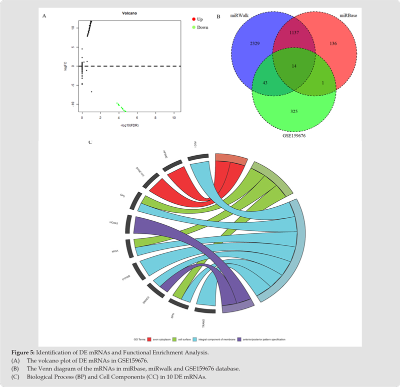 Among the total of 100 miRNAs, LASSO regression analysis was performed for further filtration. The regression coefficient diagrams were present including Lasso coefficient profiles and cross-validation parameters. Coefficient profiles decreased as the lambda value decreased (Figure 4A & B). The best lambda was 0.049. In total, 13 miRNAs were retained including hsa-miR-122-5p, hsa-miR-154-3p, hsa-miR-188-5p, hsa-miR-302c-5p, hsa-miR-515-3p, hsa-miR-602, hsa-miR-675-3p, hsa-miR-4772-5p, hsa-miR-5587-5p, hsa-miR- 6836-5p, hsa-miR-7152-3p, hsa-miR-7854-3p, hsa-miR-513c-5p. The miRNA–gene interaction table was downloaded using the miRbase and miRwalk database. Two miRNA–gene interaction networks were constructed by Cytoscape software (Figure 4C & D). GSE159676 was analyzed by “edgeR” package in R with FDR <0.05 and |log2FC| > 1.5 as the threshold. In dataset GSE159676, 383 DEGs were identified, which contained 1 up-regulated genes and 382 down-regulated genes (Figure 5A). Based on the miRbase and miRwalk database, the miRNA–mRNA interaction was constructed. It was found that a total of 14 DEGs were screened out in miRbase, miRwalk and GSE159676 dataset, which was shown by Venn diagram in Figure 5B. In order to further learn the function of AIH-related genes, 10 differential mRNAs (DE mRNAs) were found to be enriched in gene ontology (GO) database, mainly in biological process (BP) and cell components (CC), including axon cytoplasm, cell surface, integral component of membrane and anterior/posterior pattern specification (Figure 5C).