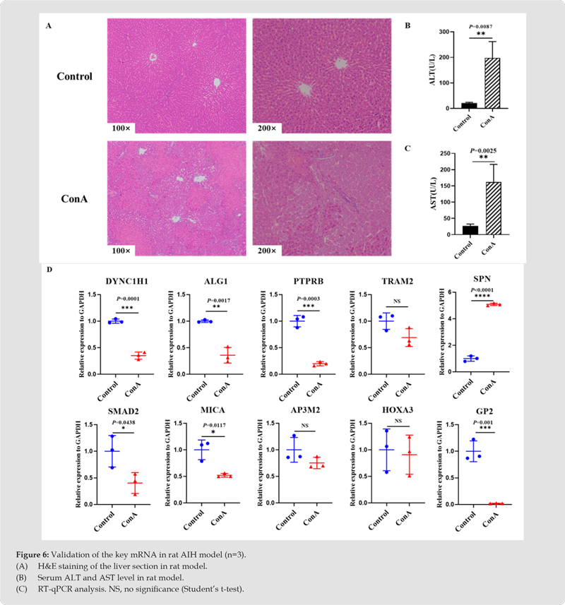 To further validate the role of the 10 DE mRNAs in AIH, we prepared the Con A-induced rat AIH model. Some studies have reported that Con A could induce AIH by activating immune cells, mainly T lymphocyte. H&E staining analysis revealed that Con A (16mg/kg) induced rat displayed infiltration of inflammatory cells and interface necrosis (Figure 6A). Compared to the control group, the Con A group had the higher level of ALT and AST (Figure 6B & C). As expected, qPCR showed that DYNC1H1, ALG1, PTPRB, SMAD2, MICA and GP2 were lowly expressed in Con A induced rat AIH model, SPN was highly expressed, while there was no significance in TRAM2, AP3M2 and HOXA3 (Figure 6D).