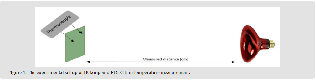 The PDLC formulation was prepared using a commercial Qingdao liquid crystal mixture (QY142), Norland Optical Adhesive pre-polymer (NOA65), Ciba Irgacure 819 and 184 photo-initiators, BASF Tinuvin TV‑400 UV absorber, Suzhou 25 m NM micro-spacers and Kaitai acrylic acid. The Eastman IR heat rejection Flexvue AgHT8-PET (thickness= 175 m; haze=0.7%; transmission=80%) and ITO-PET (thickness= 175 m; haze=1.0%) transparent conductive films. The composition of PDLC formulation (by weight) was: QY142=40%, NOA65=51%, Acrylic Acid=4%, Tinuvin=4%, Irga819=0.5%, Irga184=0.5% and micro- spacer=0.6%. The uncured PDLC formulations were pre-heated at 45°C for 10 minutes and then were poured between the vertical gap of AgHT8-PET and ITO-PET rolls on a custom-made coater/laminator system (Sigma Sivo). Under the coating rolls, the uncured coated films were passed through a pressure roll to insure the uniformity of PDLC films. The uncured PDLC films were then cured at UV intensity of 165 mW/cm2 and 0.15 meter/minute line speed. The thickness homogeneity of PDLC layers were insured by micro-spacers. The thermal testing was carried by direct exposure of the off-state PDLC films to a Philips 150W IR lamp placed at distances of 50, 40, 30, 20, and 10 cm. The front‑side and back‑side temperatures of the films were recorded using LOGGER LogMaster thermocouples, where the temperature difference: ΔT = T(front) − T(back) was used as an indicator of IR heat screening. The experimental setup of these measurements are presented in Figure 1.