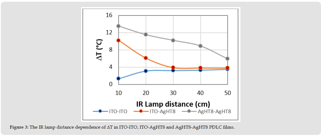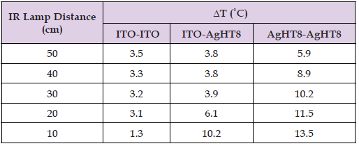 • ITO-ITO: ΔT decreases slightly from 3.5°C to 1.3°C when the lamp distance is reduced, indicating that ITO allows most of the IR radiation to penetrate and heat the PDLC bulk.