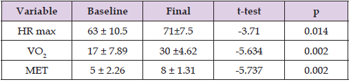 Table 1: Differences between baseline and final measurements after the cardiac rehabilitation program in postoperative patients with congenital heart disease (HRmax = maximum heart rate; VO₂ = maximal oxygen consumption; MET = metabolic equivalent).