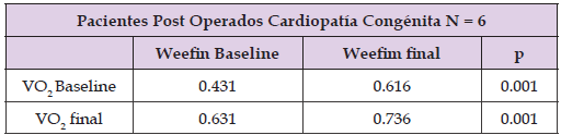 Six patients were enrolled in the cardiac rehabilitation program, with a mean age of 9 ± 3.3 years. Four were male (66.7%) and two female (33.3%). Diagnoses included atrial septal defect in four patients (66.7%) and Tetralogy of Fallot in two patients, all classified as low cardiovascular risk. In the initial exercise test, maximum heart rate was 63 ± 10.5 beats per minute, compared to 71 ± 7.5 beats per minute in the final test (p < 0.014). Mean VO₂ increased from 17 ± 7.89 to 30 ± 4.62 ml/kg/min (p < 0.002). METs increased from 5 ± 2.26 to 8 ± 1.31 (p < 0.002) (Table 1) Pearson correlation analysis showed a correlation coefficient of r = 0.431 between initial WeeFIM and VO₂, and r = 0.736 between final WeeFIM and VO₂, indicating a strong positive linear relationship between final variables (Table 2).
