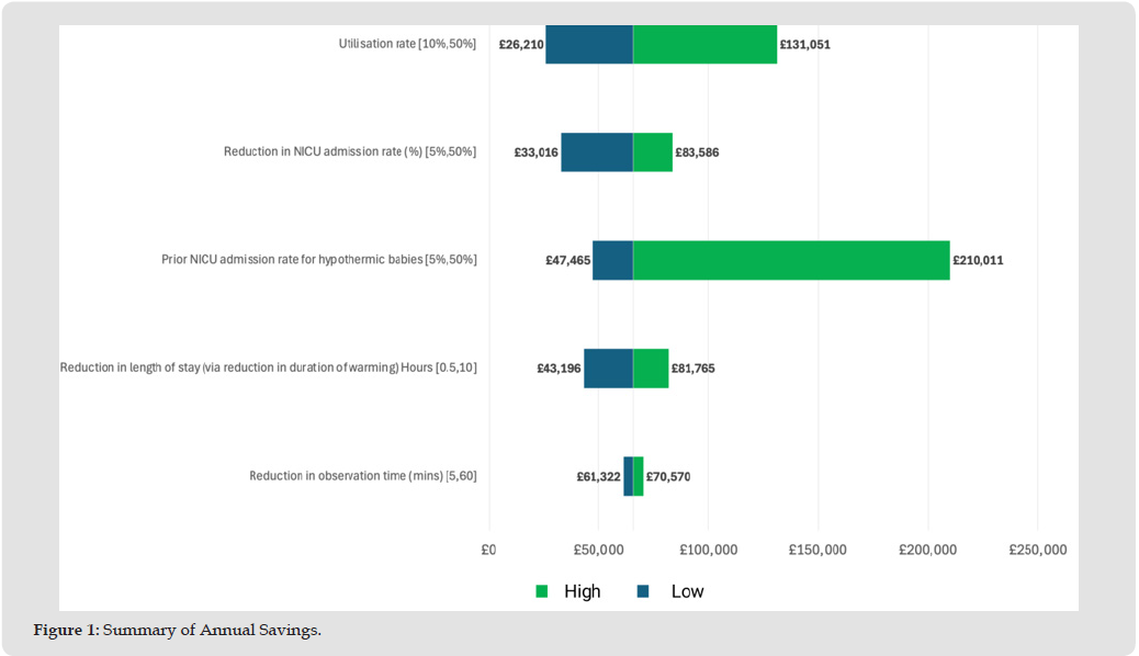 Deterministic Sensitivity Analysis: The main factors influencing the economic value of the mOm were the baseline rate of NICU admissions for hypothermia and the extent of device utilisation. Expanding use from 25% to 50% of hypothermic infants could yield savings of around £124,626 per unit annually, whereas the model suggested that reductions in use to 10% would lower annual savings to approximately £24,925. Even under a conservative assumption that only 5% of hypothermic infants would previously have required NICU admission, the device still generated an estimated £47,719 in yearly savings. Deterministic sensitivity analysis as demonstrated in Figure 1, confirmed that while the scale of savings varied, the model consistently indicated positive economic value under all plausible scenarios (Figure 1).