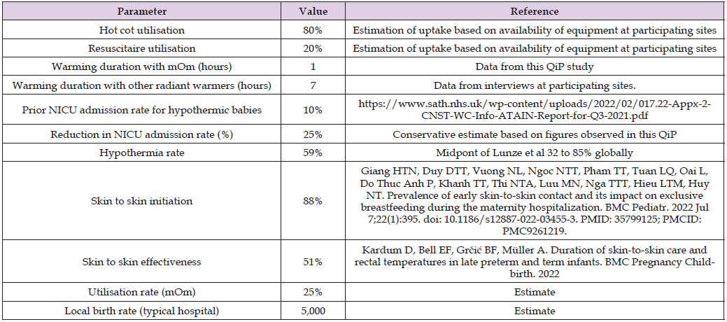Economic Saving Per Infant: An exploratory cost-consequence model to estimate the likely economic impact of the mOm was developed, the assumptions for which are provided in Supplementary Table 1. It was estimated that if the mOm was embedded into existing care pathways in a hospital with 5,000 live births per year, the savings approximate £62,313 per annum, constituted of £1,032 from 27 hours of midwife time, £31,494 from prevention of 2,060 hours in length of stay avoided through earlier warming and discharge, equivalent to approximately 86 bed days per year, and £29,118 from the prevention of 11 neonatal unit admissions per year on grounds of hypothermia. This resulted in a per child saving of £84.49.