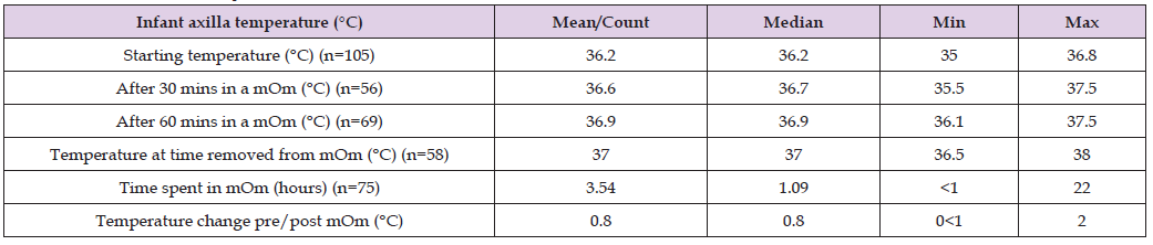 A total of 107 infants were managed with the mOm across the five sites. Gestational age data were collected for 81/107 infants, with median gestational age equal to 37 + 6 weeks (range 35 + 2 to 41 + 2 weeks) and median birth weight was 2.74kg (range 1.85 kg to 3.97 kg, n=87/107). 94.4% of infants, (101/107) were mildly hypothermic on first assessment (35.9-36.4 °C). Three infants presented with moderate hypothermia (35.0-35.8 °C), and three were normothermic but considered high-risk and placed in the incubator prophylactically. Mean and median starting temperature were both 36.2 °C (range 35.0-36.8 °C). Recruitment was well distributed: Site 1, n=22; Site 2, n=13; Site 3 and 4, n=23; Site 5, n=23.