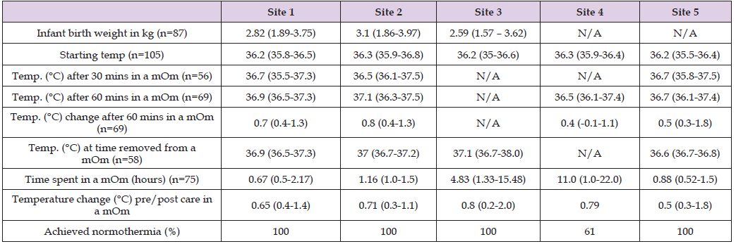 Subgroup Analysis of Median Values: Comparing data from the five sites, the mOm showed consistent benefits for thermoregulation, though effects varied. Starting temperatures were similar (median 36.2-36.3 °C). After 60 minutes, median temperatures ranged from 36.5 °C to 37.1 °C, Table 2. Overall median pre/post warming changes were 0.5 to 0.7 °C and by 30-60 minutes, most infants (93.5%) were within the normothermic range. Staff feedback indicated a perception that the incubator use was associated with improved temperature gain: “I have found the mOm warms babies faster” (Site 3); “It is better for the babies when they heat up faster” (Site 5). Table 2 shows a summary of the sub-group analyses (Table 2).