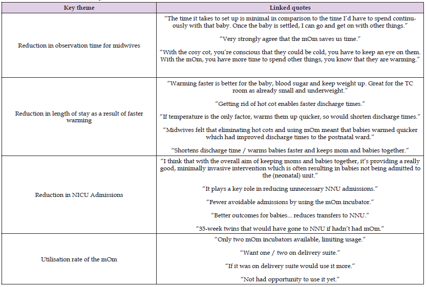 Staff Feedback: The feedback obtained from 43 midwifery and neonatal staff indicated consistent, positive impacts associated with use of the mOm (Table 3). Key themes identified included a reduction in observation time, noting that once infants were settled in the mOm, they had confidence in attending to other duties. Of neonatal staff surveyed (29/43, 67.4%) reported that excessive time to warm babies had previously been a significant problem in clinical practice. Faster warming, compared to previous existing practices, was widely perceived to improve infant outcomes, supporting better thermoregulation, stabilising blood sugar and weight, and enabling earlier discharge from transitional care to the postnatal ward. Several participants linked these improvements directly to shorter lengths of stay and fewer delays caused by temperature-related discharge criteria. Staff also observed a reduction in avoidable neonatal unit (NNU) admissions, with the mOm providing a minimally invasive means to keep mothers and babies together while avoiding escalation of care (Table 3).