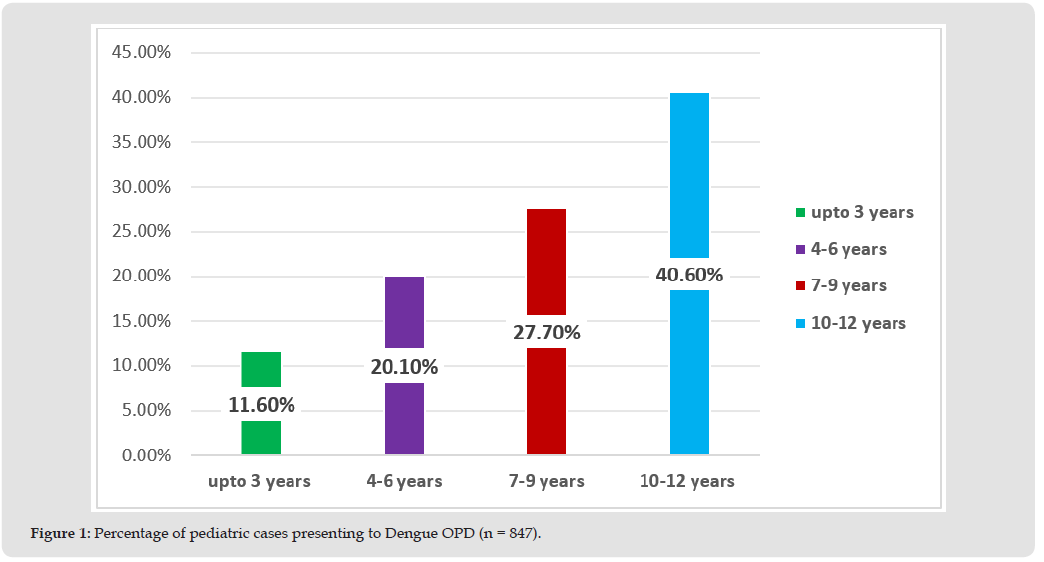 Results: The mean age of 847 pediatric dengue cases was 8 ± 3.12 years. Around 59.3% of them were males and mostly belonged to age bracket of 10-12 years. 73.9% and 23.8% of the cases belonged to Rawalpindi and Islamabad respectively. 124 were confirmed dengue cases out of which 88 had dengue fever while 31 and 5 had Dengue Hemorrhagic Fever (DHF) and Dengue Shock Syndrome (DSS) respectively. 245 out of 597 suspected cases got admitted and all were discharged in stable condition. None of the reporting cases succumbed to dengue.