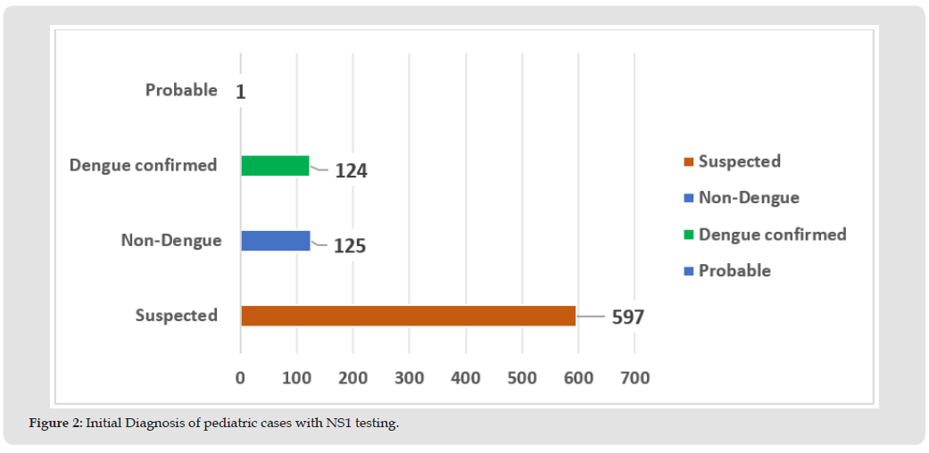 Dengue infection is emerging as a public health challenge due to its rapid spread across tropical and subtropical regions of the globe [1]. According to World Health Organization (WHO), approximately half of the global population is at risk of dengue infection and among them children are perceived as highly vulnerable particularly to severe forms of dengue due to immunological and physiological attributes [2]. Dengue infection has been reported predominantly among residents of urban and semi-urban areas [3]. Pediatric dengue presents with broad range of clinical manifestations ranging from dengue fever to severe dengue forms that include Dengue Hemorrhagic Fever (DHF) and Dengue Shock Syndrome (DSS) [4]. Clinico-epidemiological profile of dengue among children up to 14 years of age from South Asia illustrated high burden of this life-threatening infections predominantly among males [5]. Likewise, another study elucidated the progression of minority of pediatric cases to severity [6]. However, this minority is subjected to adverse clinical outcomes in the form of thrombocytopenia, hepatomegaly and raised ALT levels along with resultant complications like hypotension and profuse bleeding that necessitates timely critical care management [7]. Suspected dengue infection among children elucidates substantial global disease burden specifically in endemic zones of Asia and Latin America [8]. Increased hospital admissions of suspected pediatric dengue cases have been reported during peak season that also seems to burden the healthcare system [9].