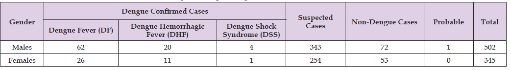 Methods: A cross-sectional analytical study was done among 847 pediatric cases who visited dengue OPD of Holy Family Hospital Rawalpindi during October-November 2024 with symptoms. Patients were enrolled in the study through consecutive non-probability sampling. Data was collected from Pediatric department of Holy Family Hospital through with their informed consent. Data was analyzed using SPSS version 27.0. Descriptive statistics were applied. Gender-wise number of children suffering from different types of dengue disease were also isolated.